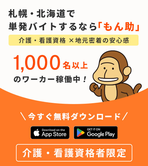 「もん助」は、北海道(現在、札幌市、札幌市近郊エリアの求人が多く掲載!)に特化した介護・福祉専門のスキマバイトアプリです。